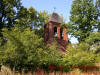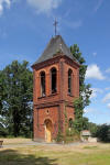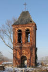 Dzwonnica na zdewastowanym cmentarzu ewangelickim oraz zabudowa miejscowości.