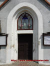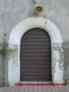 Drzwi wejściowe do świątyni, płyta nagrobna wmurowana w ścianę kościoła oraz zegar słoneczny na wieży.