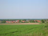 Panorama wsi, domy w miejscowości oraz zatarty czasem napis na szczycie jednego z nich.