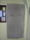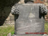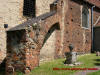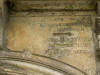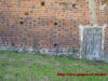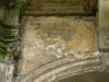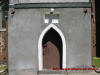 Drzwi wejściowe do świątyni, stara klamka, podpora ściany, pomnik nagrobny oraz ściana kościoła od strony wschodniej.