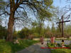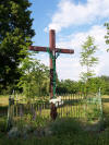 Drewniany krzyż w centrum miejscowości oraz dom który oparł się rozbiórce.