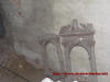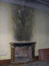 Zniszczone kominki w pałacu i widok (ze schodów) na dawny dziedziniec ujęty z trzech stron zabudowaniami folwarku.