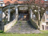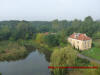 Betonowe schody będące zejściem do stawu, wyjście na taras znajdujący się na drugiej kondygnacji, wieża pałacu będąca znakomitym punktem widokowym, widok z wieży oraz budynek przy drodze głównej w miejscowości.