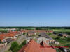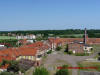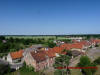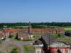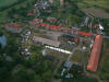Widok na dawną zabudowę folwarczną z dachu pałacu.