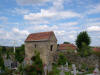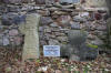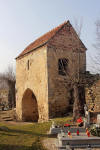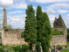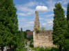 Ruina kościoła p.w. św. Jerzego, brama do świątyni, stary nagrobek, krzyże pokutne oraz kościół p.w. Zesłania Ducha Świętego.