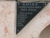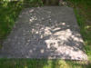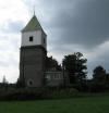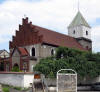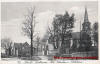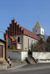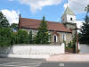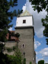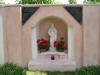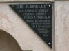 Kapliczka w murze okalaj¹cym koœció³ oraz p³yta nagrobna le¿¹ca na ziemi przed koœcio³em.