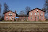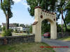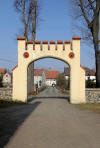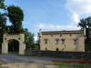 Pa³ac w Zarêbie Górnej, brama wjazdowa do dawnego maj¹tku, emblemat na bramie oraz budynek gospodarczy w pobli¿u.