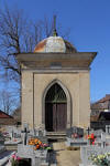 Kościół cmentarny p.w. św. Anny, tablica informacyjna, stare mauzoleum na cmentarzu oraz krzyże pokutne.