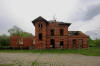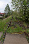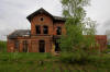 Budynek nieczynnego dworca kolejowego oraz fragment linii kolejowej.