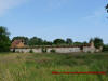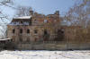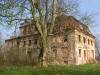 Dawny dziedziniec przed ruiną pałacu oraz zabudowa mieszkalno - gospodarcza dawnego majątku.