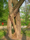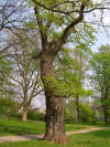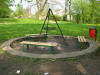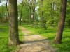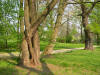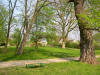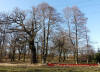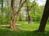 Park znajdujący się pomiędzy rozebranym pałacem a ruiną dawnego młyna oraz gość w parku.