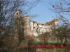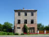 Budynek przy drodze głównej w miejscowości oraz dom w sąsiedztwie ruin zamku.