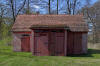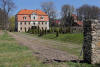 Zniszczona zabudowa gospodarcza w otoczeniu pałacu.