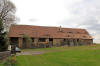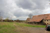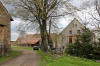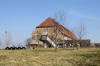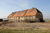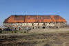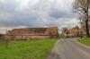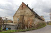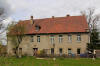 Dwór w dawnym majątku Oberhof (Rittergut Alt Seidenberg), zabudowa gospodarcza oraz zniszczony herb na ścianie budynku.