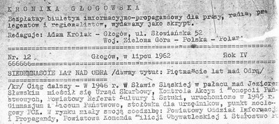Czołówka pisanej przez Adama Królaka na maszynie "KRONIKI GŁOGOWSKIEJ".