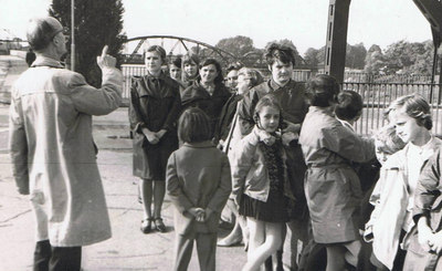 Adam Królak z oprowadzaną wycieczką przy głogowskim moście.