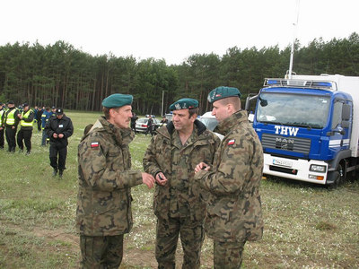 żołnierzami. Usuwają skutki powodzi. Pracuje tam min. transporter pływający (PTS) i ciężka spycharka (BAT-M). W zagrożone powodzią tereny wyjechała