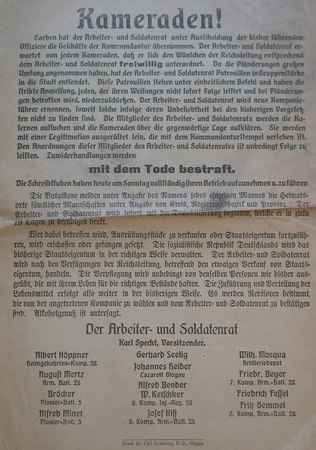 10 listopada -22 letni żołnierz -Karl Specht- staje na czele nowoutworzonej Rady Robotników i Żołnierzy. Jak wynika z opublikowanej odezwy, w jej