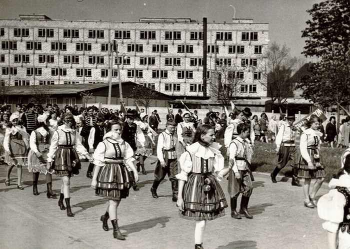 pierwszomajowym na tle budowanego hotelu "Kasztelańskiego". (Zbiory I. Dominiaka)
