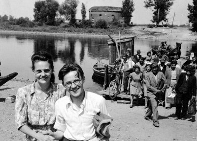 dr Wiesław Juszkiewicz z małżonką po zejściu z promu nad Odrą, 1947 r. W głębi