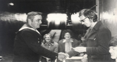 Zbyszek Jabłoński, zwycięzca konkursu, otrzymuje upominek od przedstawiciela marynarzy.